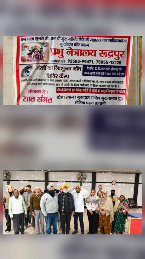 हल्द्वानी, ठंडी सड़क स्थित गुरुद्वारा गुरु नानकपुरा में प्रभु नेत्रालय रुद्रपुर द्वारा चार साहिबजादों और माता गुजरी जी की पावन स्मृति में निशुल्क नेत्र जांच शिविर का आयोजन किया गया। सरदार कमलजीत सिंह गुजराल और दिलप्रीत सिंह ने बताया कि गोविंदपुरा गुरु नानकपुरा क्षेत्र के लोग बड़ी संख्या में शिविर में पहुंचे।आंखों के विशेषज्ञ डॉक्टरों की टीम ने सभी का निशुल्क नेत्र परीक्षण किया तथा आवश्यक चिकित्सीय सहायता प्रदान की। गुरुद्वारा प्रबंधक कमेटी ने प्रभु नेत्रालय के सदस्यों व डॉक्टरों का हार्दिक आभार व्यक्त किया।इस शिविर का मुख्य उद्देश्य लोगों को उच्च गुणवत्ता वाली निशुल्क नेत्र जांच व उपचार सुविधा उपलब्ध कराना था। प्रबंधक कमेटी के हरजीत सिंह सच्चर, जसपाल सिंह कोली, अमरजीत सिंह आनंद, कंवलजीत सिंह गुजराल, दिलप्रीत सिंह ने क्षेत्रवासियों से स्वास्थ्य सेवाओं का लाभ उठाने तथा नियमित नेत्र जांच कराने का आह्वान किया।शिविर में बड़ी संख्या में उपस्थित लोगों ने आंखों की जांच कराई और उचित उपचार प्राप्त किया। प्रबंधक कमेटी ने सभी से अपील की है कि वे नियमित रूप से आंखों की जांच करवाएं और स्वास्थ्य का विशेष ध्यान रखें।