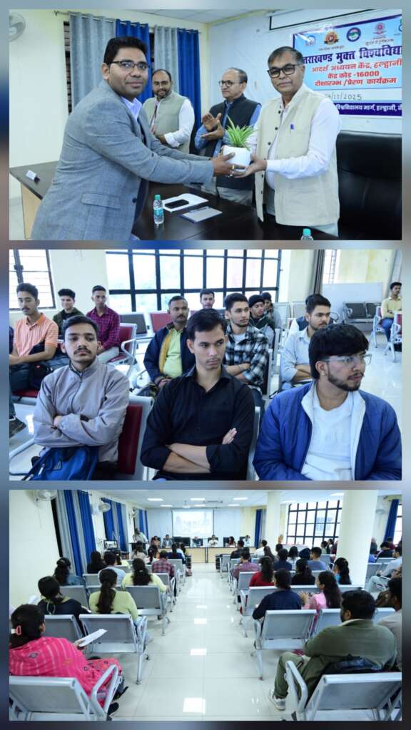 हल्द्वानी। उत्तराखण्ड मुक्त विश्वविद्यालय (यूओयू) के आदर्श अध्ययन केन्द्र हल्द्वानी (16000) में सत्र जुलाई 2025 के नव प्रवेशित शिक्षार्थियों के लिए दीक्षारंभ एवं प्रेरण कार्यक्रम का आयोजन 4 नवम्बर 2025 को किया गया। यह कार्यक्रम माननीय कुलपति प्रो. नवीन चन्द्र लोहनी के निर्देशन एवं मार्गदर्शन में संपन्न हुआ। इसमें 96 शिक्षार्थियों ने ऑफलाइन और 115 शिक्षार्थियों ने ऑनलाइन माध्यम से भाग लिया।कार्यक्रम का मुख्य उद्देश्य नव प्रवेशित शिक्षार्थियों को विश्वविद्यालय की कार्यप्रणाली, सुविधाओं तथा शैक्षणिक नियमों से अवगत कराना रहा, ताकि वे अपनी शैक्षिक यात्रा को सुदृढ़ रूप से आरम्भ कर सकें।डॉ. विशाल कुमार शर्मा, समन्वयक आदर्श अध्ययन केन्द्र, ने विश्वविद्यालय की स्थापना, उद्देश्य तथा अध्ययन केन्द्र से संबंधित उपयोगी सुविधाओं की जानकारी दी। उन्होंने नियमित परामर्श सत्रों की अनिवार्यता और शिक्षार्थियों की भागीदारी पर विशेष बल दिया।निदेशक अकादमिक प्रो. पी.डी. पंत ने नई शिक्षा नीति (एनईपी) के अंतर्गत पाठ्यक्रम संबंधी दिशा-निर्देश तथा विश्वविद्यालय द्वारा दी जा रही शिक्षार्थी हितैषी योजनाओं की जानकारी साझा की। समाज विज्ञान संकाय की निदेशक प्रो. रेनू प्रकाश ने ओपन एंड डिस्टेंस लर्निंग (ओडीएल) प्रणाली के महत्व और इससे जुड़ी संभावनाओं पर प्रकाश डाला।डॉ. सुमित प्रसाद ने प्रवेश और परीक्षा प्रणाली से संबंधित विषयों पर विस्तार से चर्चा की तथा सत्रीय कार्य, मुख्य परीक्षा, बैक व सुधार परीक्षा की प्रक्रिया को समझाया। एमपीडीडी सह प्रभारी डॉ. वीरेन्द्र सिंह ने पुस्तकों के वितरण, मुद्रण प्रक्रिया एवं पोर्टल के माध्यम से पाठ्य सामग्री को ट्रैक करने की सुविधा की जानकारी दी।डॉ. राजेश मठपाल ने कार्यशालाओं व प्रयोगात्मक परीक्षाओं के महत्व पर विस्तृत रूप से प्रकाश डाला। कार्यक्रम की अध्यक्षता प्रो. गिरिजा पांडे, निदेशक सीका एवं सहायक क्षेत्रीय निदेशालय द्वारा की गई। उन्होंने ओडीएल शिक्षा की संभावनाओं और विश्वविद्यालय के सतत प्रयासों पर चर्चा की तथा शिक्षार्थियों को शैक्षणिक दिशानिर्देश प्रदान किए।सह-समन्वयक डॉ. विनय रावत ने कार्यक्रम में उपस्थित सभी अतिथियों, निदेशकों एवं शिक्षार्थियों का आभार व्यक्त किया। इस अवसर पर शिक्षार्थियों द्वारा पूछे गए प्रश्नों का समाधान डॉ. शर्मा और डॉ. रावत ने संयुक्त रूप से किया।कार्यक्रम में डॉ. प्रदीप पंत, प्रशासनिक परामर्श दाता श्रीमती कमला राठौर, सहायक क्षेत्रीय निदेशक श्रीमती रेखा बिष्ट, आईसीटी टीम के श्री मोहित रावत, श्री राकेश पपनै और फोटोग्राफर श्री विभु कांडपाल सहित अनेक अधिकारी एवं शिक्षण सदस्य उपस्थित रहे। इस दौरान पुस्तक मेले का भी आ