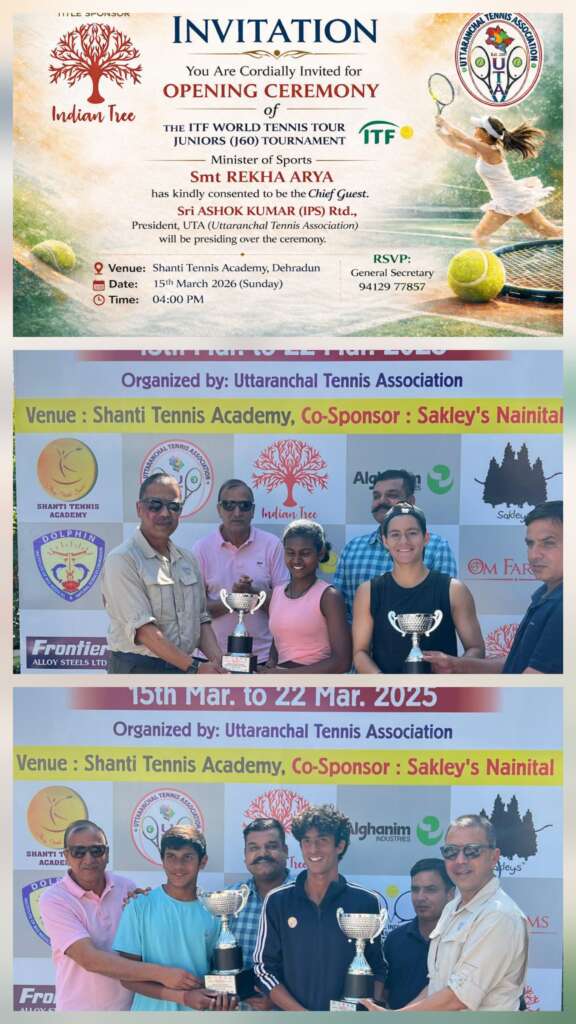 देहरादून, 13 मार्च 2026: शांति टेनिस एकेडमी, डालनवाला, देहरादून (जनपद-देहरादून) में 15 से 20 मार्च तक पांच दिवसीय इंडियन ट्री आइटीएफ जूनियर्स टेनिस टूर्नामेंट (जे-60) का आयोजन हो रहा है। उत्तरांचल टेनिस एसोसिएशन (यूटीए), देहरादून द्वारा आयोजित इस प्रतियोगिता के लिए एकेडमी के अंतरराष्ट्रीय स्तर के टेनिस कोर्ट पर प्राकृतिक और कृत्रिम दूधिया रोशनी की व्यवस्था की गई है।8 देशों के 150 से अधिक युवा खिलाड़ी लेंगे भागयूटीए के सेक्रेटरी जनरल सुमित गोयल ने स्टेट लेवल वर्चुअल मीटिंग में बताया कि इस अंतरराष्ट्रीय टूर्नामेंट में 8 देशों के लगभग 150 बालक-बालिकाओं के भाग लेने की संभावना है। 13 से 18 वर्ष आयु वर्ग के खिलाड़ियों के बीच सिंगल्स और डबल्स इवेंट खेले जाएंगे। क्वालीफाइंग और मेन ड्रॉ 32 का होगा। सभी तैयारियां पूरी हो चुकी हैं, जिसमें वेन्यू पर पानी, चाय, ब्रेकफास्ट, लंच, फर्स्ट एड बॉक्स और फिजियोथेरेपी जैसी सुविधाएं निःशुल्क उपलब्ध होंगी।क्रमबद्ध आयोजन, उसके बाद सीनियर्स टूर्नामेंटयूटीए के अध्यक्ष एवं रिटायर्ड डीजीपी अशोक कुमार ने कहा कि प्रतियोगिता को अत्यंत क्रमबद्ध तरीके से आयोजित किया जाएगा। उन्होंने जानकारी दी कि इस जूनियर्स टूर्नामेंट के तुरंत बाद शांति टेनिस एकेडमी में ही सीनियर्स आइटीएफ एमटी-200 प्रतियोगिता का भी आयोजन होगा।उद्घाटन में मंत्री रेखा आर्या मुख्य अतिथिउपाध्यक्ष विजेंद्र चौहान ने बताया कि टूर्नामेंट का शुभारंभ 15 मार्च को अपराह्न 4 बजे उत्तराखंड सरकार की कैबिनेट मंत्री (महिला सशक्तिकरण एवं बाल विकास, खाद्य एवं नागरिक आपूर्ति, खेल) श्रीमती रेखा आर्या मुख्य अतिथि के करकमलों द्वारा होगा। विशिष्ट अतिथि के रूप में डीजीपी उत्तराखंड श्री दीपम सेठ मौजूद रहेंगे।शांति टेनिस एकेडमी वर्ष भर टेनिस प्रशिक्षण के साथ विभिन्न स्तर की प्रतियोगिताओं का सफल आयोजन करती रहती है, जो देहरादून को टेनिस हब के रूप में स्थापित कर रहा है।