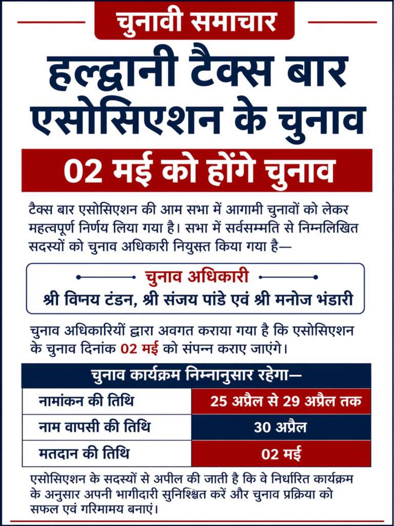 टैक्स बार एसोसिएशन चुनाव 2 मई को, विनय टंडन समेत तीन अधिकारियों की नियुक्ति