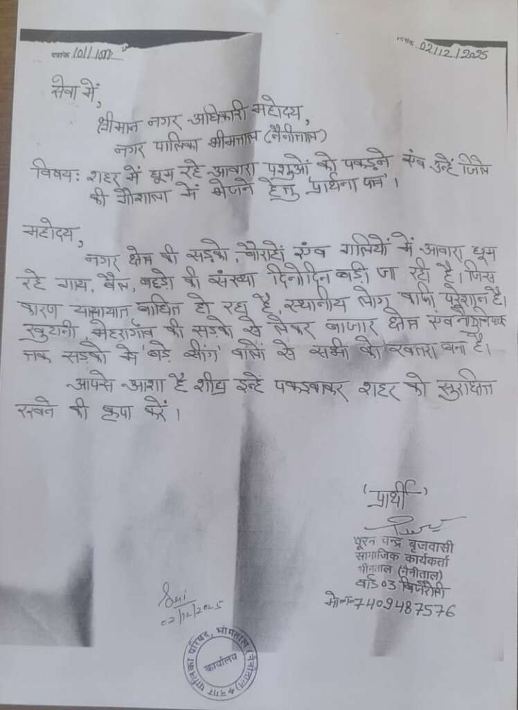 भीमताल, 02 दिसंबर। नगर पालिका क्षेत्र में खुले में घूम रहे आवारा गाय, बैल और बछड़ों से स्थानीय लोग, व्यापारी एवं पर्यटक काफी परेशान हैं। खासतौर पर मेहरा गाँव, खुटानी से लेकर नौकुचियाताल तक की मुख्य पर्यटक मार्गों पर बड़े-बड़े सींग वाले बैल एक-दूसरे से भिड़ते देखे जा रहे हैं। इससे न केवल लोगों की जान जोखिम में पड़ रही है बल्कि बाजार व भीड़-भाड़ वाले इलाकों में वाहनों की आवाजाही भी प्रभावित हो रही है।समाजिक कार्यकर्ता पूरन चंद्र बृजवासी ने मंगलवार को नगर पालिका कार्यालय पहुंचकर अधिशासी अधिकारी राहुल कुमार को ज्ञापन सौंपा। ज्ञापन में उन्होंने आपातकालीन हालात को बताते हुए आवारा पशुओं को पकड़कर जल्द से जल्द गौशाला भेजने की मांग की।ज्ञापन मिलने पर अधिशासी अधिकारी राहुल कुमार ने आश्वासन दिया कि अब आवारा पशुओं को पकड़ने के लिए पूरी तैयारी कर ली गई है। जल्द ही एक टीम बनाकर इन पशुओं को नगर से बाहर स्थित गौशाला में पहुँचाने का काम शुरू किया जाएगा।स्थानीय निवासियों का कहना है कि आवारा पशुओं के कारण कई बार दुर्घटना की आशंका बनी रहती है, जिससे क्षेत्र में सुरक्षा की चिंता बढ़ गई है। भीमताल जैसे प्रमुख पर्यटन स्थल की छवि पर भी इसका नकारात्मक प्रभाव पड़ रहा है। स्थानीय लोग प्रशासन से शीघ्र और कड़े कदम उठाने की अपेक्षा कर रहे हैं।भीमताल नगर पालिका की इस पहल पर सभी की निगाहें टिकी हुई हैं और लोग जल्द समाधान की उम्मीद कर रहे हैं।,,,